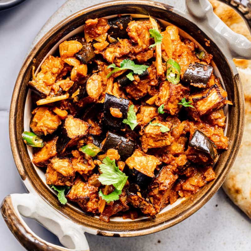 V • VG • GF • DF – Ingredients: aubergine, onion, tomato, spices – Aubergine cooked in a gently spiced onion and tomato masala.