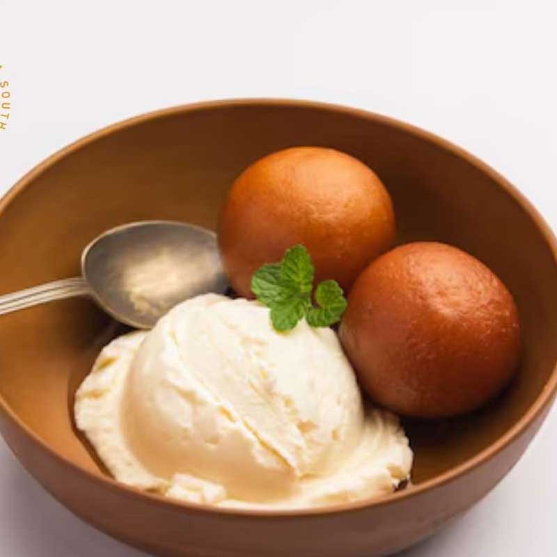 V – Ingredients: gulab jamun (milk – dairy, flour – gluten), ice cream (dairy) – Classic gulab jamun served with a scoop of ice cream.