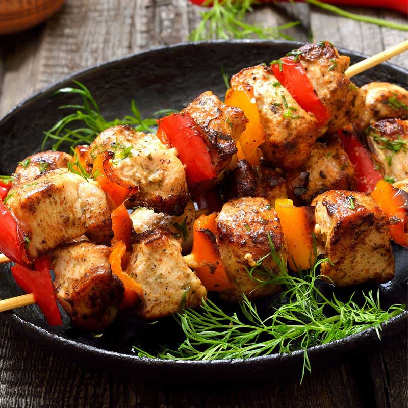GF • DF – Ingredients: chicken, onion, capsicum, spices – Grilled chicken skewers with onion and capsicum.